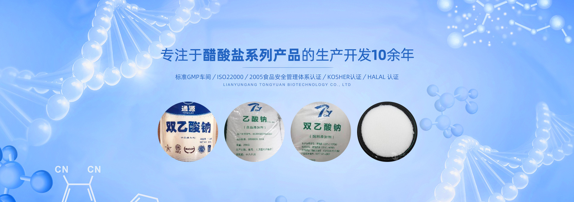 連云港市通源生物科技有限公司 是生產雙乙酸鈉、無水醋酸鈉、三水醋酸鈉、醋酸鉀、乙酸鈉、丙酸鈉、丙酸鈣和氯化鉀等系類醋酸鹽產品的專業制造商。公司專注于醋酸鹽系列產品的生產開發10余年,是國內專業醋酸酸鹽產品生產基地。  目前,我們已和全球30多個國家和地區建立長期的業務合作關系,是中國較大的雙乙酸鈉生產商和出口商之一。作為中國食品添加劑和配料協會理事單位,通源公司已建成標準GMP車間5000余平方米,通過了ISO22000:2005食品安全管理體系認證、KOSHER認證、HALAL 認證等,這些都是我們提供高質量產品和優良服務的前提和確保。  生產出色產品,提供優良服務,滿足顧客需要,是我們努力的目標。愿和我們的朋友們攜手,共... →查看詳細